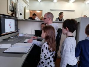 Najprej so v pripravi tiska skenirali (s pomočjo, seveda) svoje risbe, ki smo jih narisali že v vrtcu in prinesli s seboj. Nato so skupaj z oblikovalcem grafičnih vsebin svojo sliko obdelali na zaslonu, izbrali so barvo za svoje ime in priimek ter jo natisnili na poseben format papirja. V proizvodnem delu tiskarne so nam s posebnim rezalnim strojem odrezali prazne liste, dodali prej natisnjene naslovnice, vse skupaj perforirali ter speli s spiralo. Nastali so zvezki z otrokovim imenom in risbo na naslovnici.