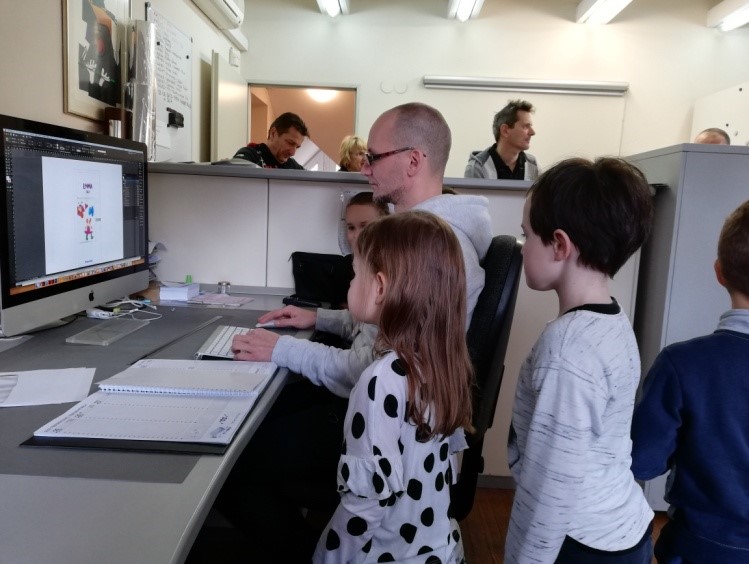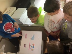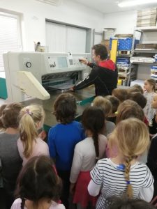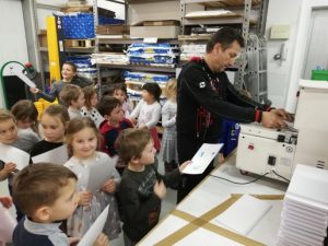 V sklopu projekta Razvijanje predbralne pismenosti v vrtcu smo si ogledali čisto pravo družinsko tiskarno – Unigrafiko Žohar v Štorah. Povabili so nas Žigovi starši, ki so lastniki tiskarne. S prostovoljnim zbiranjem odpadnega papirja, ki nastaja v grafiki kot odpadni produkt, so zbrani denar namenili za avtobusni prevoz. V tiskarni smo si ogledali prostore za pripravo tiska in prostore za proizvodnjo, kjer poteka digitalni tisk in offset tisk in kjer se opravlja dodelava izdelkov: zarez papirja, lepljenje, spenjanje in zgibanje izdelkov. Predstavitev je bila zasnovana tako, da so otroci lahko sami sodelovali v procesu tiskanja.