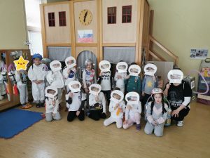 S pomočjo staršev pa smo si izdelali tudi pustni kostum. Postali smo namreč astronavti in tako na pustni modni reviji enote Luna še drugim otrokom predstavili delček vesolja.