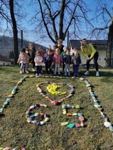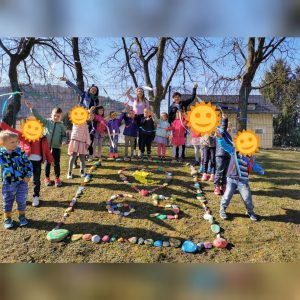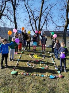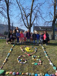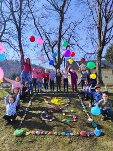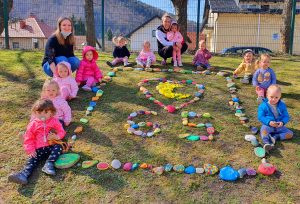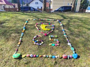 - aprila 2021 je naš vrtec praznoval 65. rojstni dan, zato smo mu na igrišču enote Luna že en dan prej pripravili presenečenje…. Vsak izmed nas je že v tednu otroka pobarval in porisal svoj kamen. Skupina najstarejših otrok je te kamne postavila v obliko LUNE in SRCA…. Saj imamo RADI naš vrtec iz srca do lune!